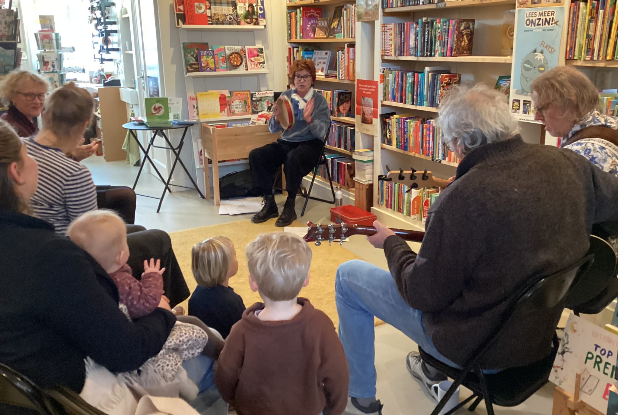 De voorleessessie in de Arnhemse kinderboekenwinkel was ook een groot feest. Wanda heeft "Klein Jantje is jarig" voorgelezen. Na het voorlezen was het tijd voor muziek met Stijn en Marcel. Alle kinderen, ouders en grootouders hebben uit volle borst meegezongen.